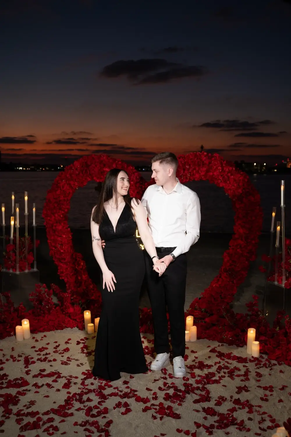 • Luxury Proposal Décor – Choose your dream look: a grand heart-shaped floral frame or giant “MARRY ME” letters, surrounded by lavish silk flower arrangements, tall candelabras, and an abundance of romantic candles.